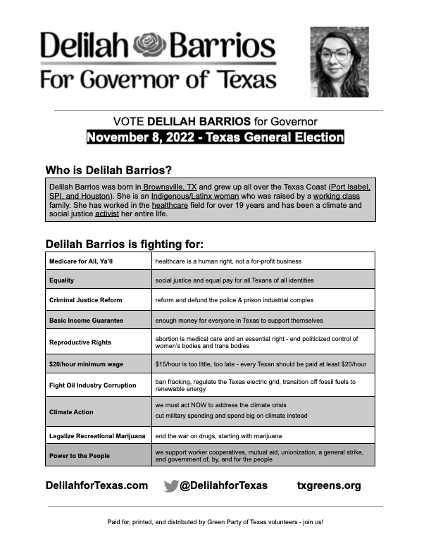 Help us get the word out about our Green candidate for Texas Governor, Delilah Barrios! She is a true working class candidate who is of the People, not a millionaire like both candidates of Democrat/Republican duopoly. We need Green supporters and comrades like you to help us circumvent the corporate media's censorship of our GPTX candidates. Print out this flyer in English and Spanish via the link below, post it around your neighborhood, send it to friends and family, and hand it out to folks in your area so that they know they can (and should!) vote for Delilah and they do not have to settle for the same (awful!) choice of Democrat-vs-Republican on the ballot this November. Vote Green!