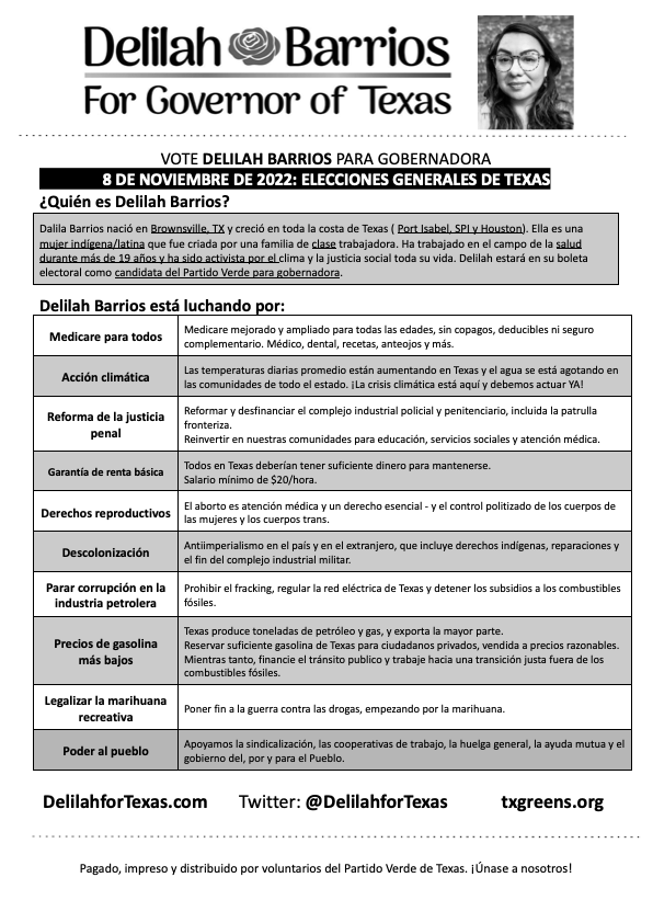 ¡Ayúdenos a correr la voz sobre nuestra candidata del Partido Verde a la gubernatura de Texas, Delilah Barrios! Ella es una verdadera candidata de la clase trabajadora que es del Pueblo y no es millonaria como lo son ambos candidatos del duopolio demócrata/republicano. Hacen falta simpatizantes y camaradas del Partido Verde como usted para ayudarnos a esquivar la censura de los medios corporativos en contra de nuestros candidatos del Partido Verde. Imprima este volante en inglés y español a través del siguiente enlace, péguelo al rededor de su vecindario, envíeselo a sus amistades y familiares, y repártalo a la gente que encuentre en su área para que sepa que se puede (¡y se debe!) votar por Delilah y no se tiene que conformar con las mismas dos opciones de demócrata-vs-republicano (¡ambas pésimas!) en la boleta electoral este noviembre. ¡Vote por el Partido Verde!
