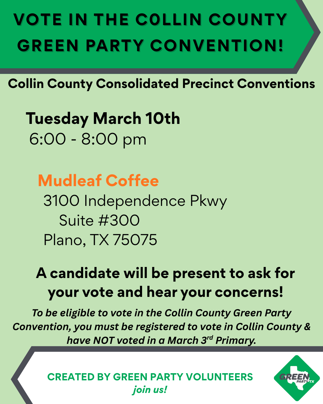 Since the vast majority of voters do not vote in the duopoly primary (upwards of 70%) they are still eligible to vote in the Green Party conventions which will take place on March 10 from 6-8pm at Mudleaf Coffee Shop in Plano. Visit www.txgreens.org/collin for more info.