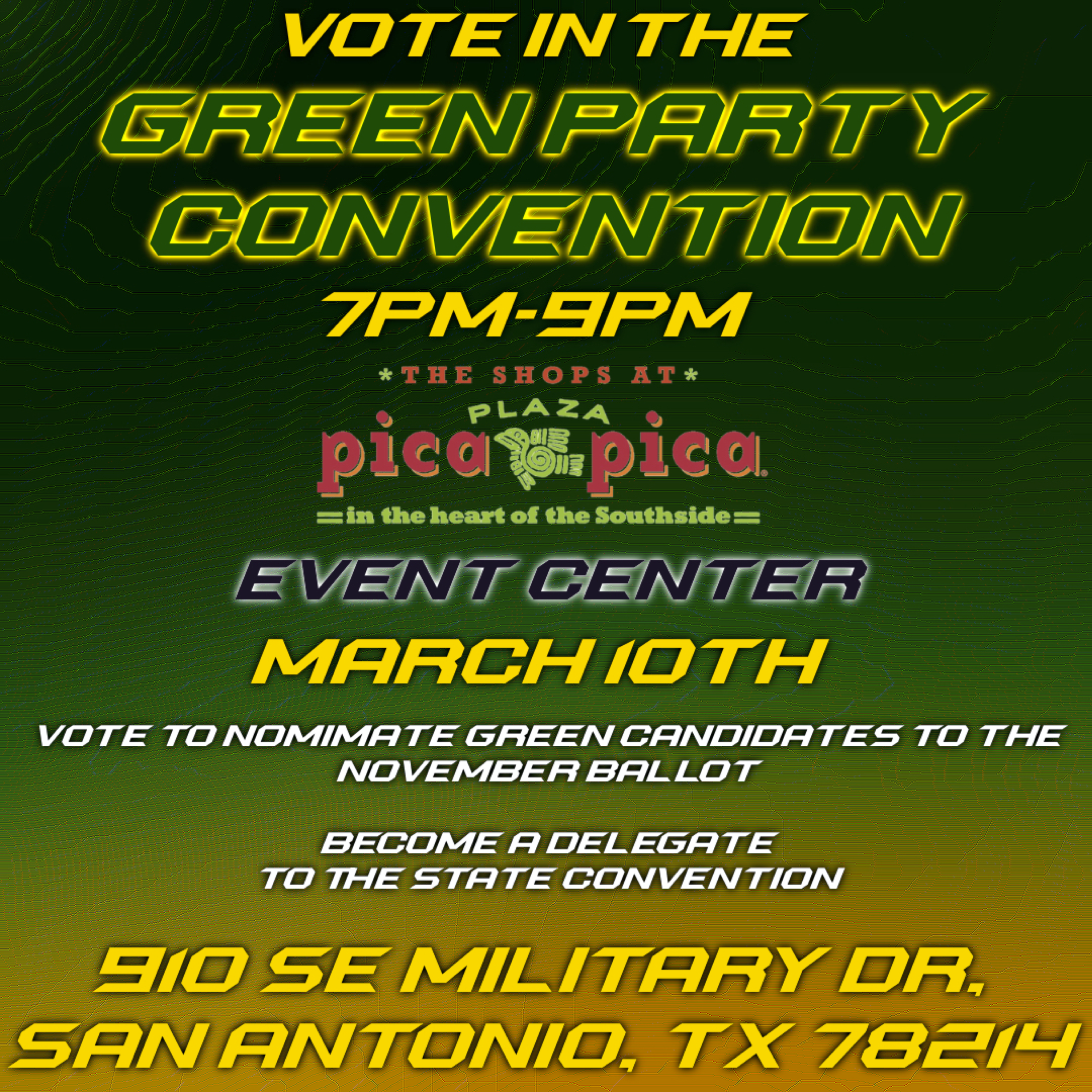 Bexar County voters, mark your calendars for March 10! Do not vote in the March 3 primary. Save your vote til March 10 and vote to nominate Green candidates at our convention.