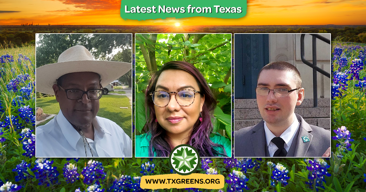 "During the 2022 State Convention of the Green Party of Texas on April 9th, the voting results from our precinct conventions in participating countries held in Baxar, Collin, Denton ,Harris ,Tarrant ,Travis were certified, officially making Alfred Molison our nominee for Texas Land Commissioner, Hunter Crow our nominee for Texas Railroad Commissioner, and Delilah Barrios our gubernatorial nominee! We thank all our candidates for standing as Greens in 2022, and encourage all supporters of peace, justice, democracy, & sustainable living to connect with and support their campaigns."