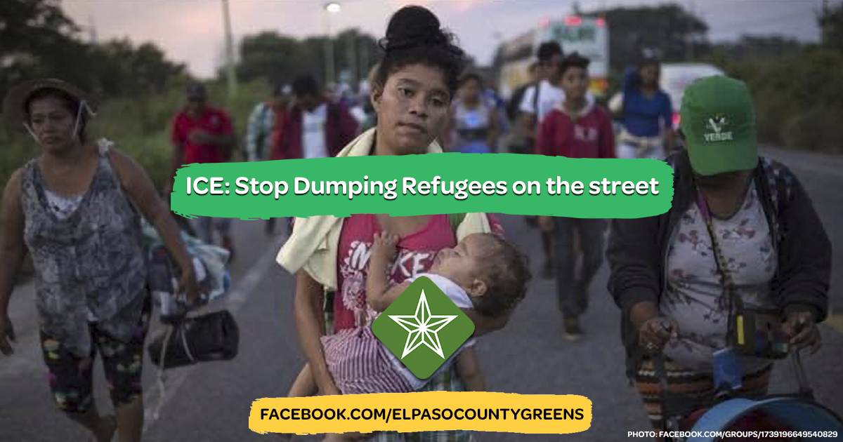 El Paso, Texas — El Paso and other border towns have been helping refugees find safe temporary residence and assisting with basic living needs for years. Recent actions by US Immigration and Customs Enforcement (ICE) have dramatically increased the stress on organizations providing refugee assistance. The Green Party of El Paso County assesses this to be a critical situation for the community and immediate action by the US government is needed to avoid further deterioration.